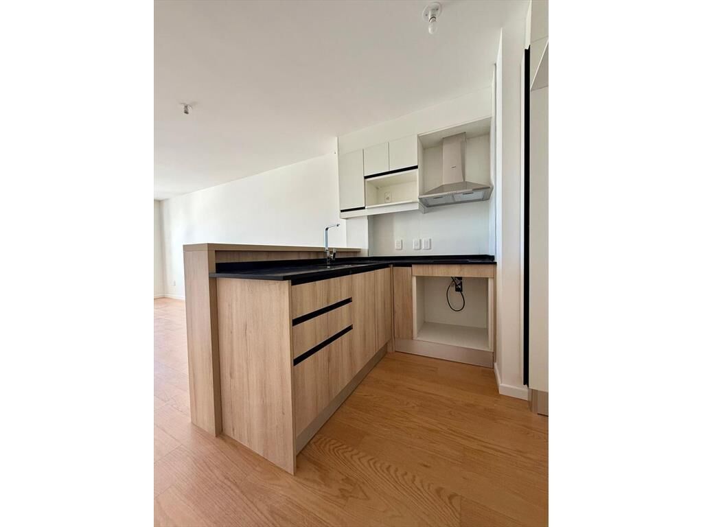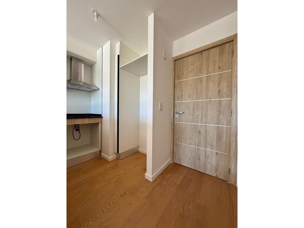 Living comedor con salida al patio. Cocina integrada con barra y muebles sobre y bajo mesada. Pisos de madera. Se entrega con anafe y extractor.