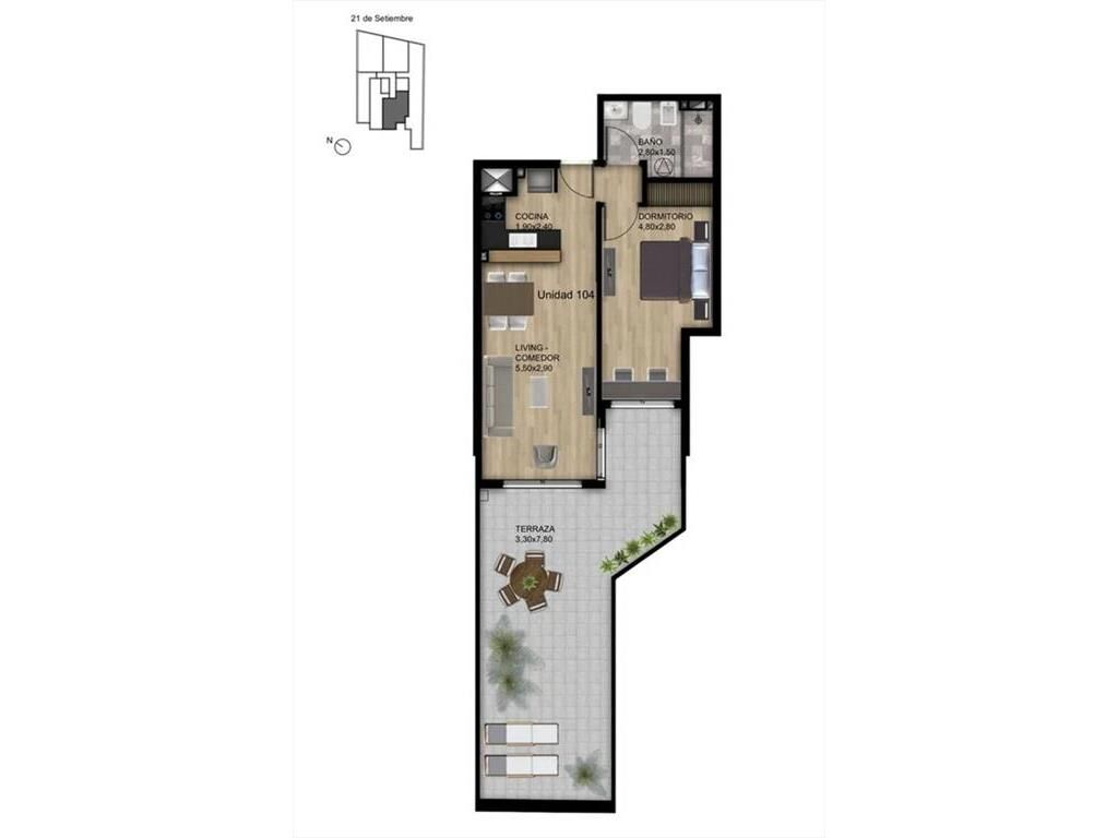 Piso 1 orientado al contrafrente con patio de 34 m2.