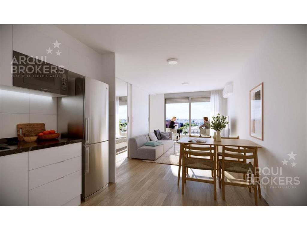 Living comedor con terraza al frente, cocina integrada con placares bajo y sobre mesada, armario para lavarropas y calefón.