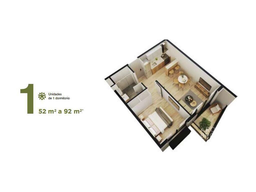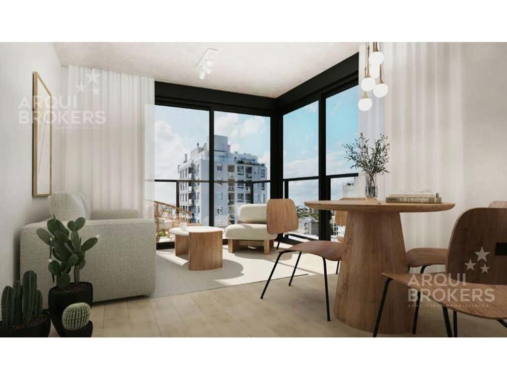 Living comedor con terraza, cocina integrada, 1 dormitorio y 1 baño completo.
