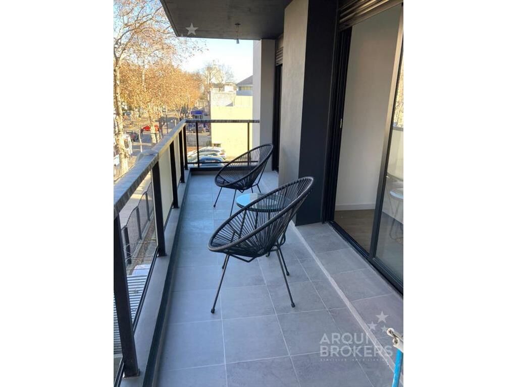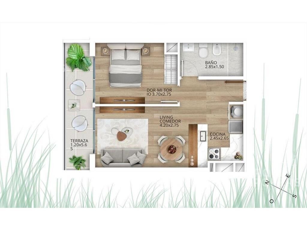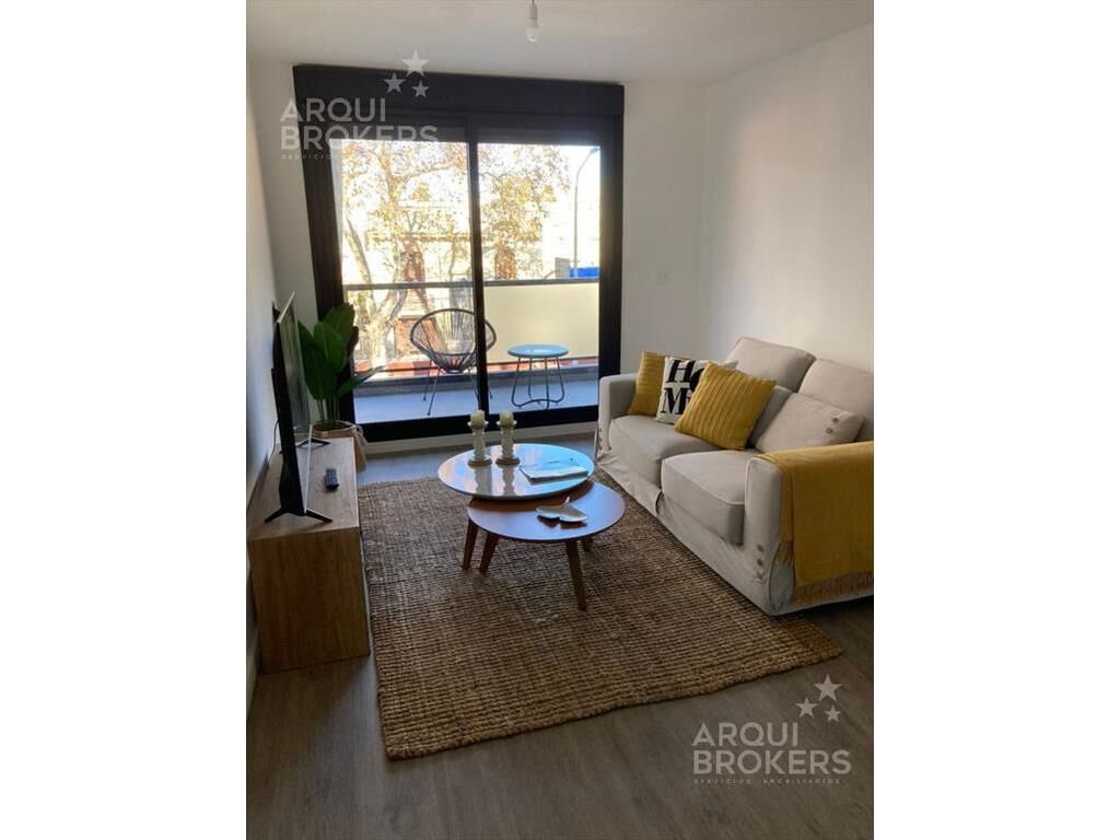 Living comedor con terraza, cocina integrada, 1 dormitorio y 1 baño.
