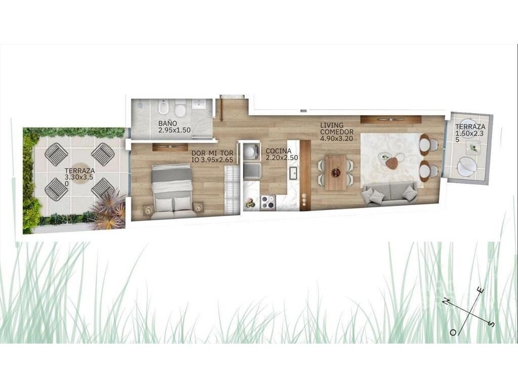 Living comedor con terraza, cocina integrada de concepto abierto con mesada en "U", conexión para lavadora y calefón, muebles aéreos y bajo mesada de gran calidad. 1 Dormitorio con salida a patio. Baño completo con ventilación natural.
