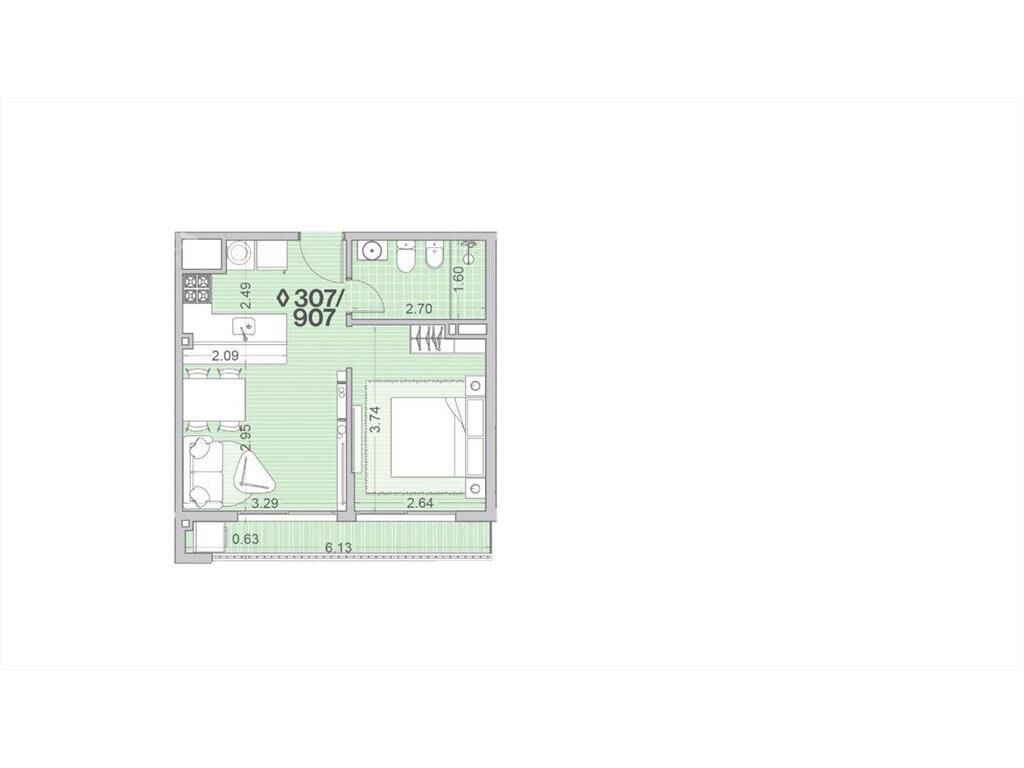 Living comedor con terraza, cocina integrada, 1 dormitorio y 1 baño completo.