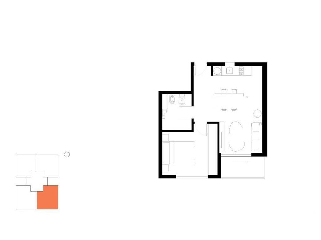 Living comedor con terraza, cocina integrada, 1 dormitorio y 1 baño.