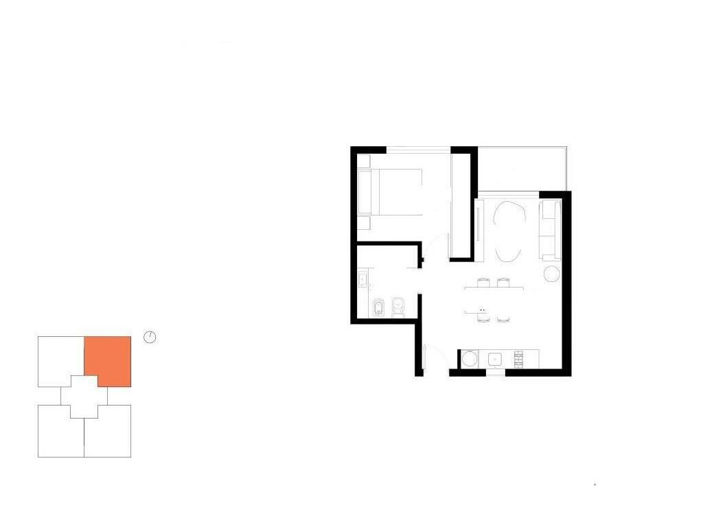 Living comedor con terraza, cocina integrada, 1 dormitorio y 1 baño.