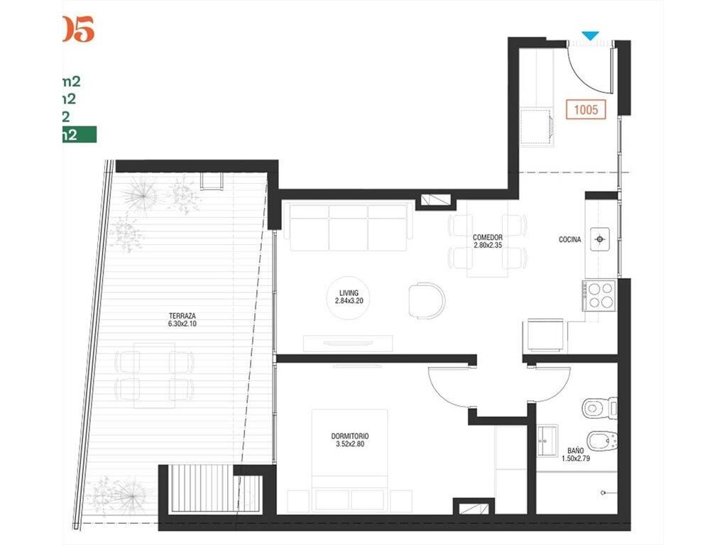 Área; 49m²; hall de acceso con placard despojador con conexión de calefón y lavarropas. Living comedor, cocina integrada con muebles sobre y bajo mesada, salida a gran terraza con parrillero de 19m², baño completo. dormitorio con placard tambien con salida a terraza,