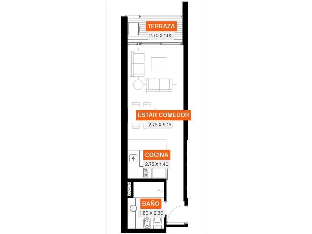 Se trata de la unidad 104 al frente con 43m2 internos y 3m2 de terraza.