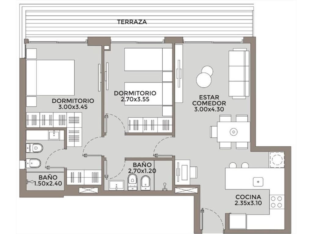 Living comedor, cocina integrada con barra, muebles aereos y bajo mesada, con calefon, camapana y anafe ya instalados. Dormitorio principal con baño en suite y placard. Segundo dormitorio tambien con placard y segundo baño completo. Balcon de 10 m².