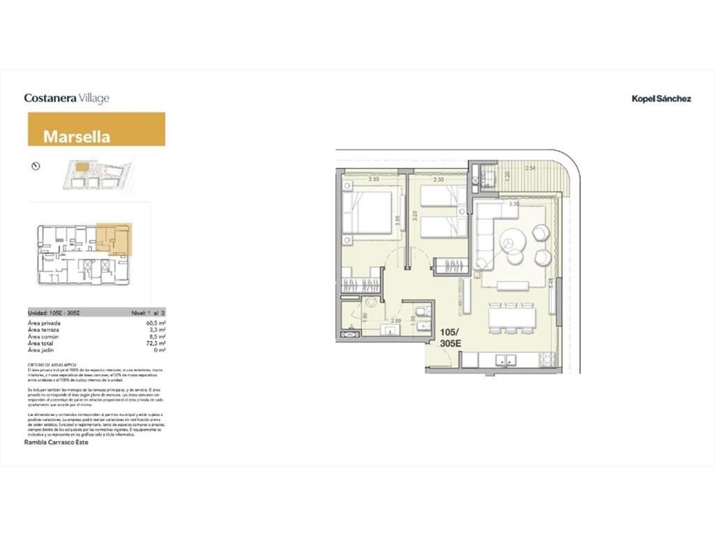 El apartamento, ubicado en el primer piso (Unidad 105) de la Villa Marsella, cuenta con: