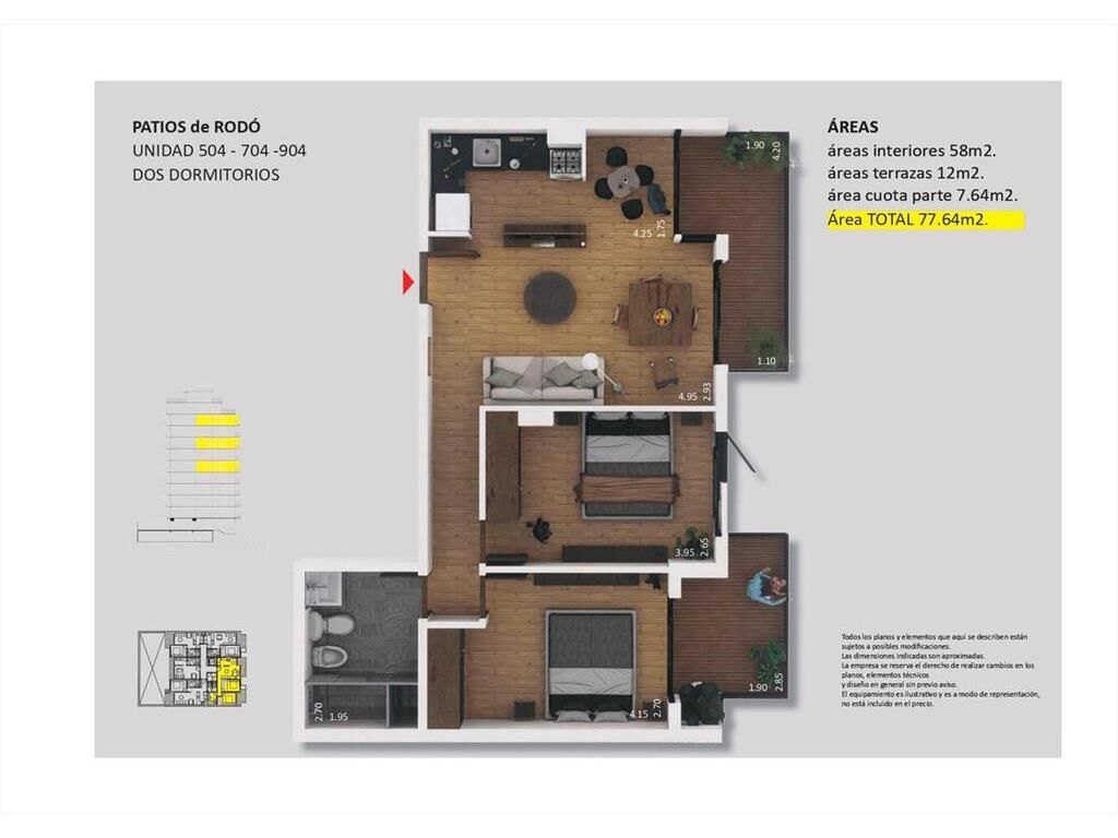La UNIDAD 704 de dos dormitorios, se desarrolla al frente con 58 m2 de área privada y 12 m2 de terraza, teniendo cómodas dimensiones para una excelente circulación en el área.