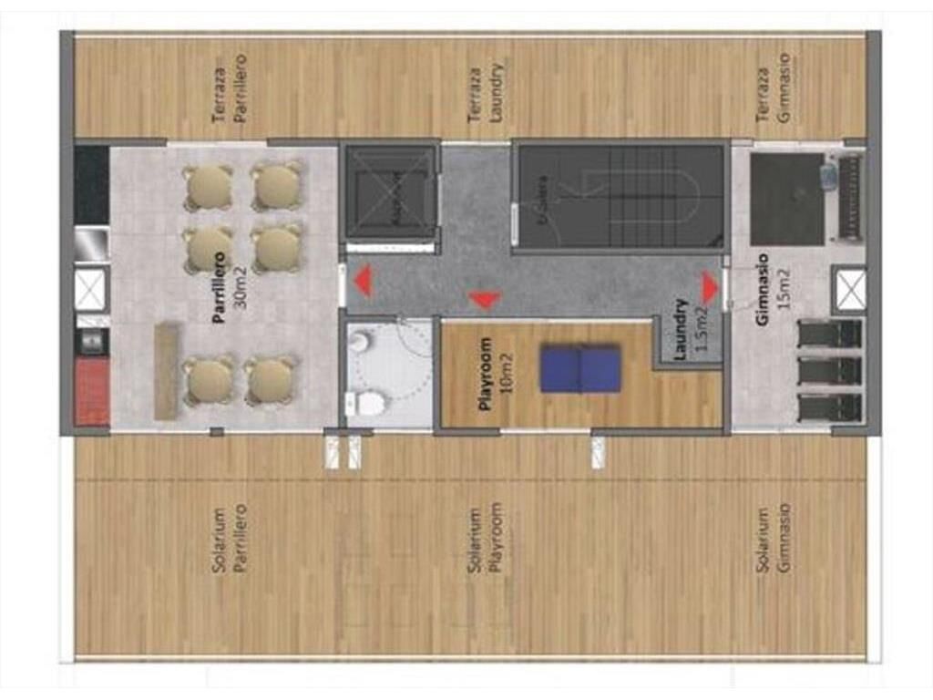 En el último nivel el edificio posee un parrillero, gimnasio, playroom todos con salida al solárium y con terraza al frente y contrafrente del edificio. Además contará con Laundry.