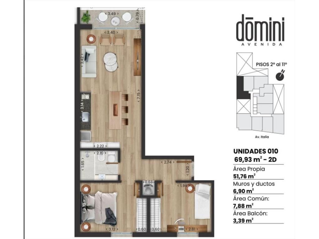 La unidad cuenta con 51,76m2 edificados y 3,39 de terraza. Al entrar nos encontramos con ambos dormitorios y el baño, mas adelanta esta el living comedor con la cocina que da la terraza.