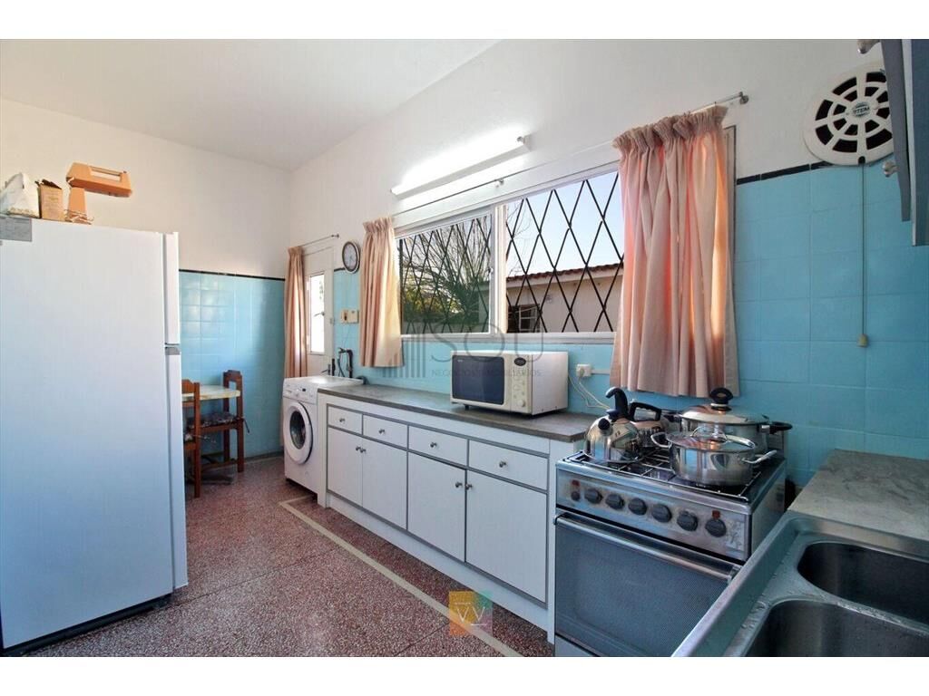 Cocina definida con muebles aéreos y bajo mesada, con conexión para el lavarropas.