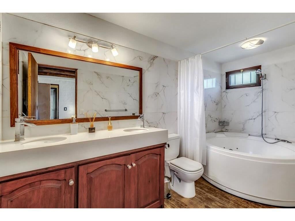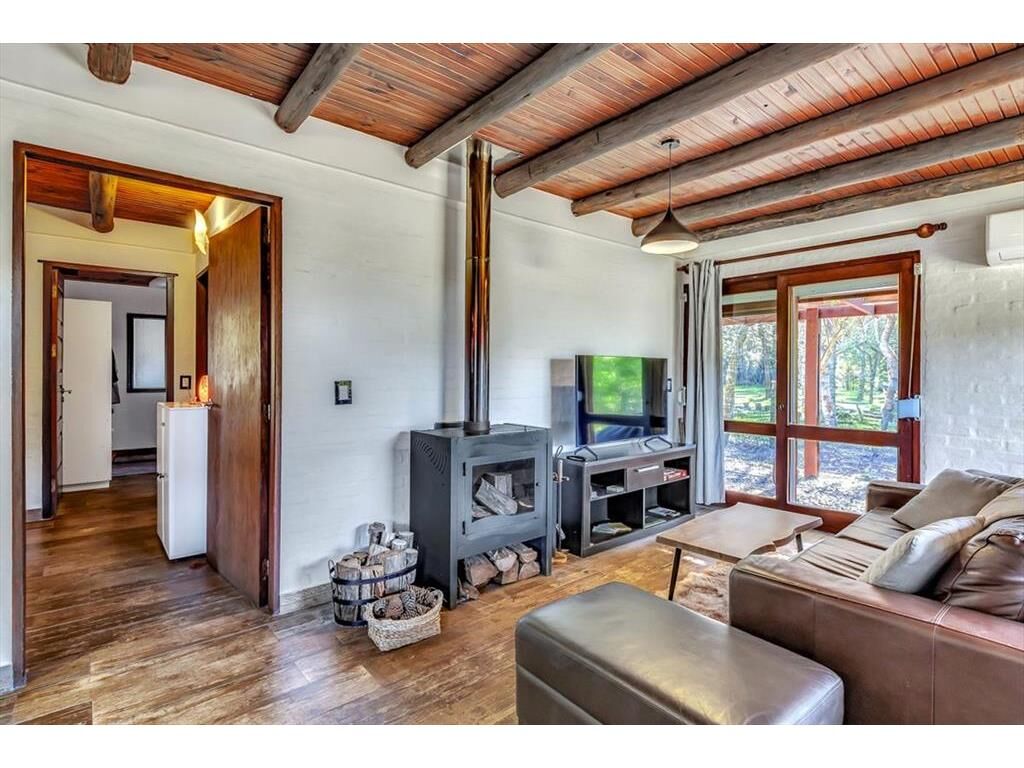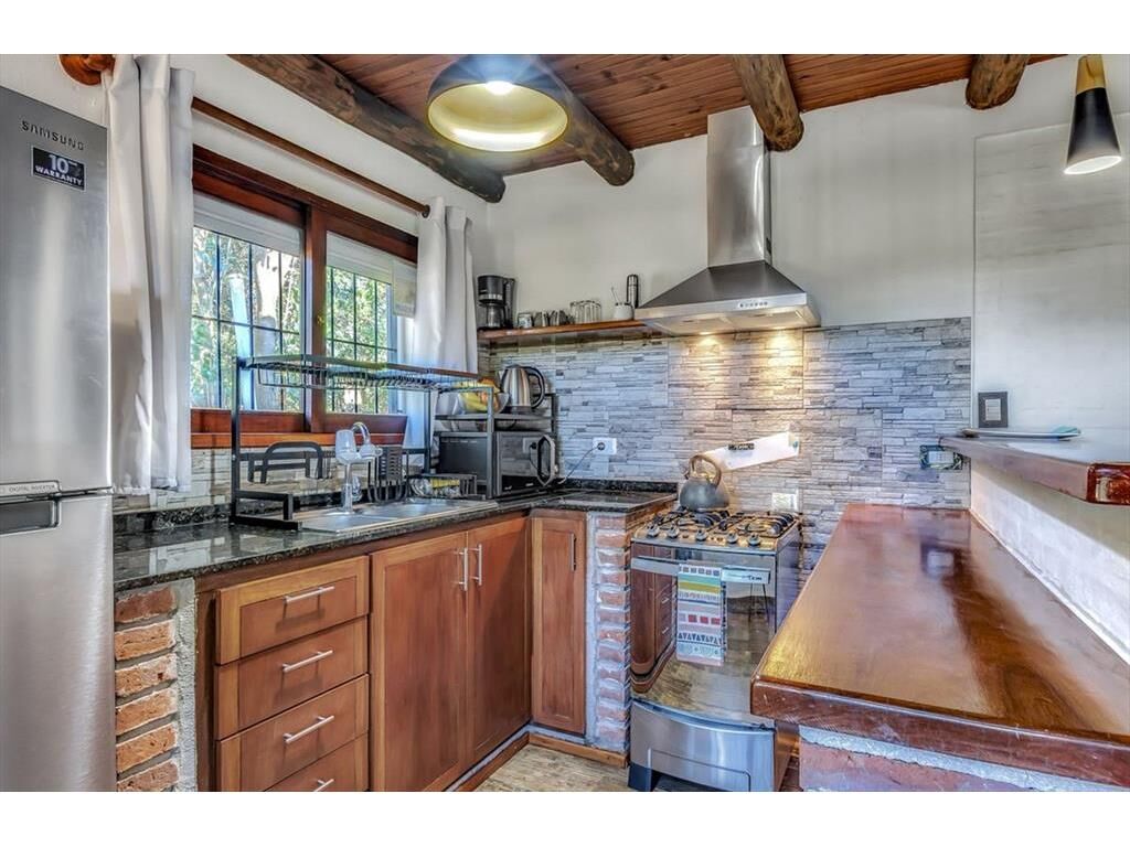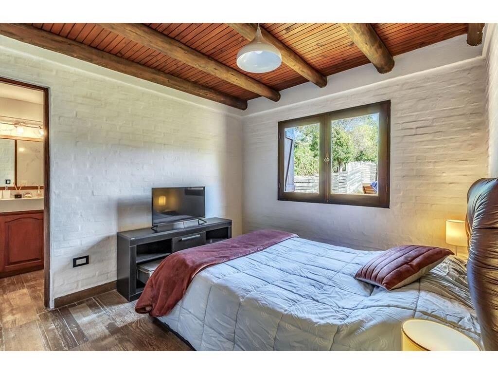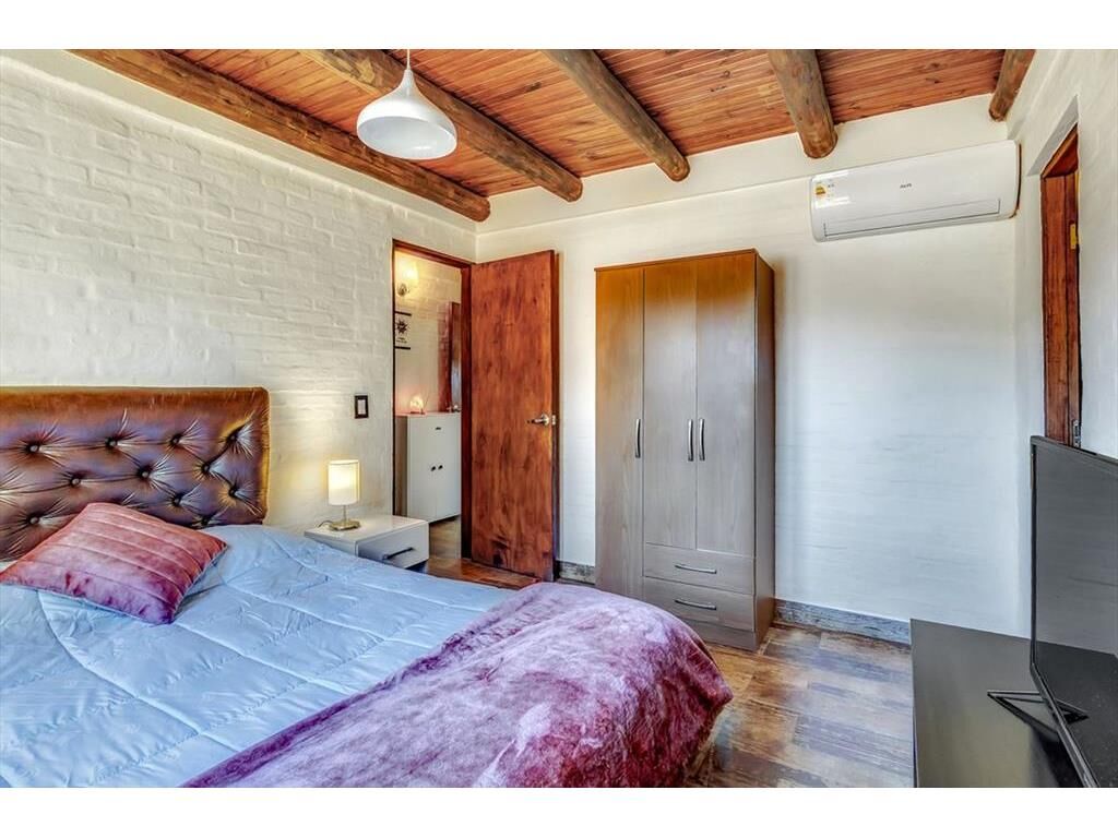 Entre sus destacados interiores, se encuentran 3 dormitorios, 2 baños (uno en suite con jacuzzi), living comedor, cocina integrada con barra, estufa a leña de alto rendimiento y aire acondicionado en todos los ambientes. En el exterior, la propiedad ofrece una piscina climatizada de agua salada, un área de parrillero techado con playroom, y un jardín con diversos espacios sociales. Cuenta también con un ingreso techado para 2 vehículos, con pérgola y chapa de policarbonato.