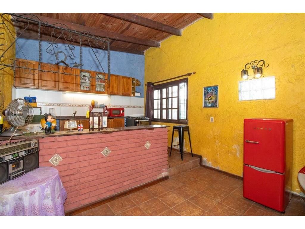 Cocina equipada con placares sobre y bajo mesada, barra pasaplatos y comedor con estufa a leña de hierro.