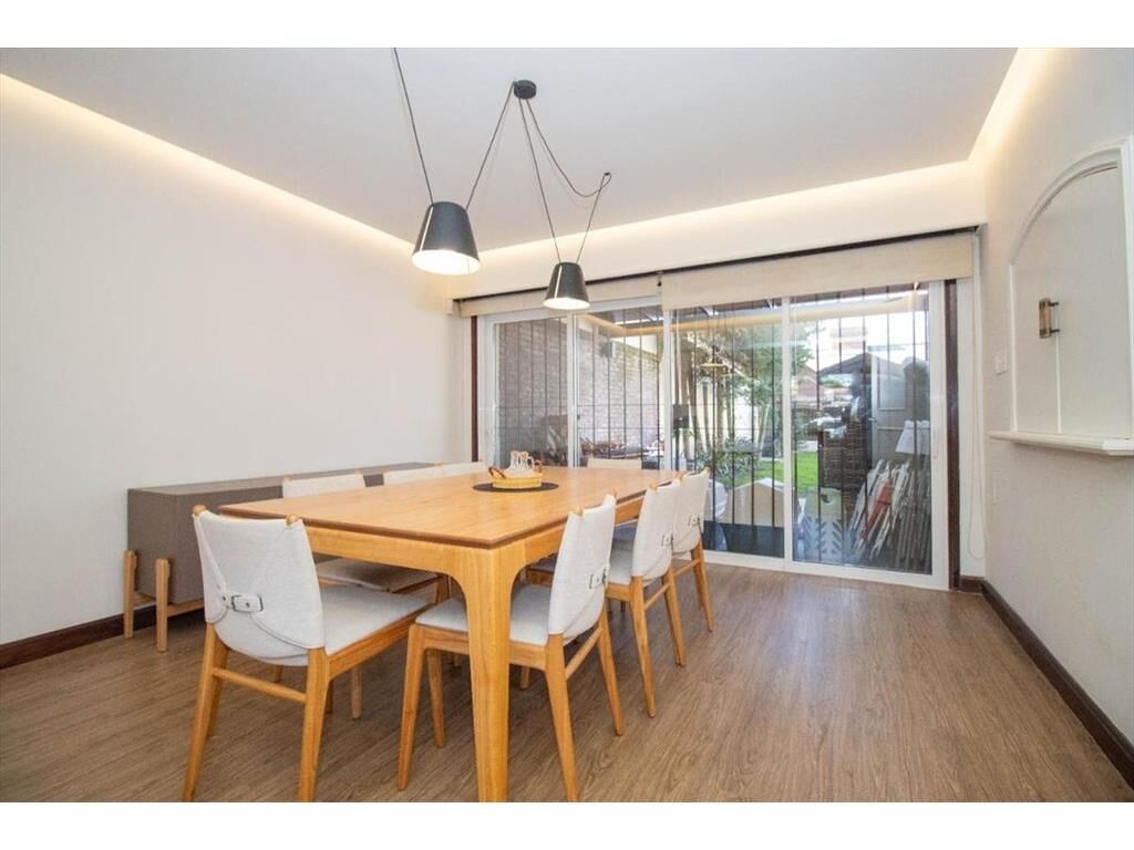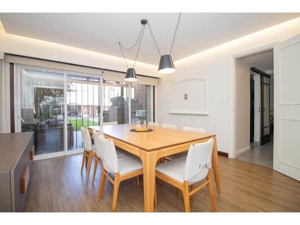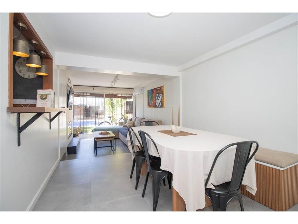 Al ingresar un hall de distribución con despojador con gran capacidad. Puerta de hierro corrediza para acceder a un amplio living comedor con estufa a leña y con una gran ventana que da al frente y otro gran ventanal que da al jardín y comunica con un espacio exterior techado.