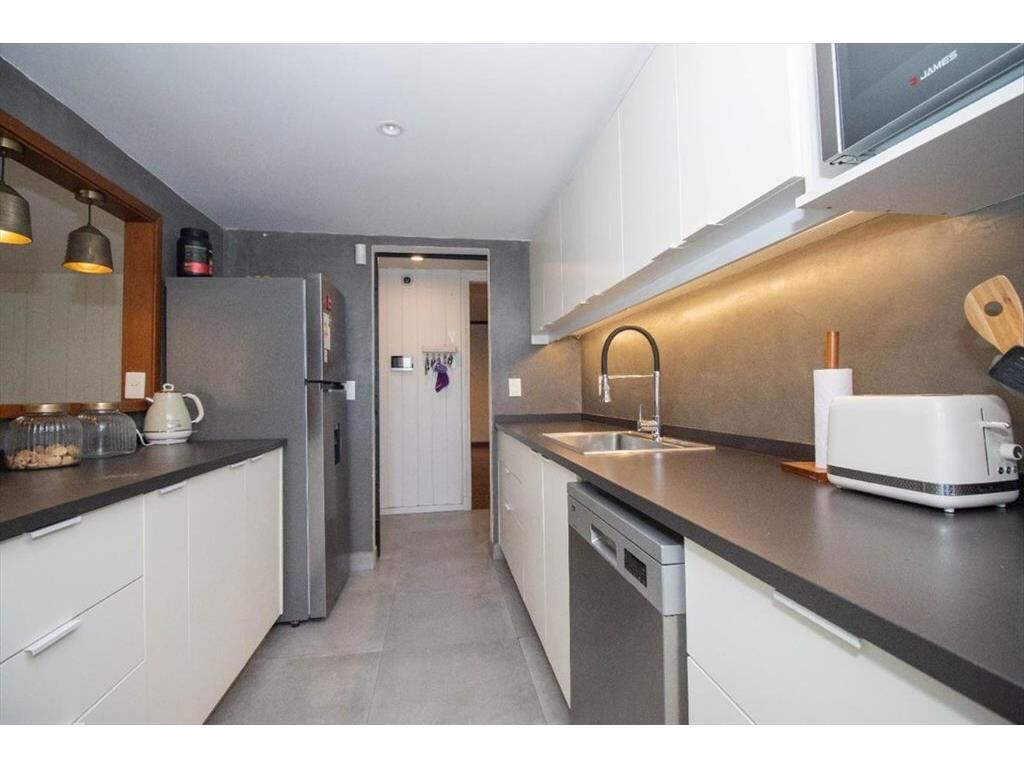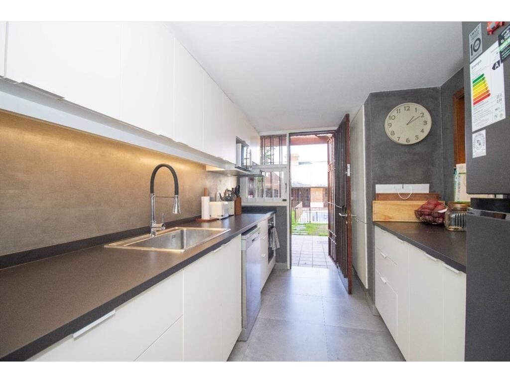 Cocina definida con un muy lindo diseño y con acceso al jardín. Muebles aéreos y bajo mesada, horno anafe empotrado con campana de extracción. Y una abertura / ventana con barra que comunica con el estar, haciéndolo muy funcional.