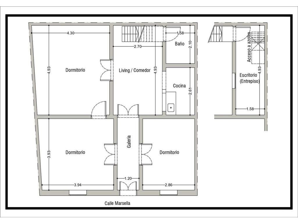 Consta de dos dormitorios al frente, ubicados junto al acceso principal, y un distribuidor central que conecta con un tercer dormitorio, baño y cocina.