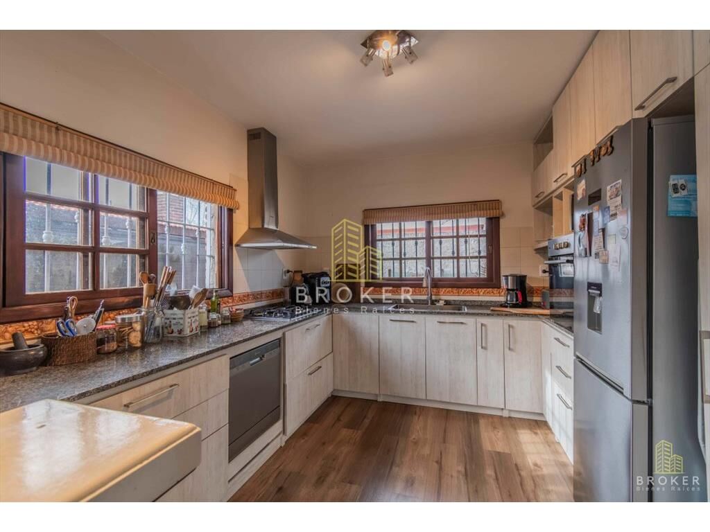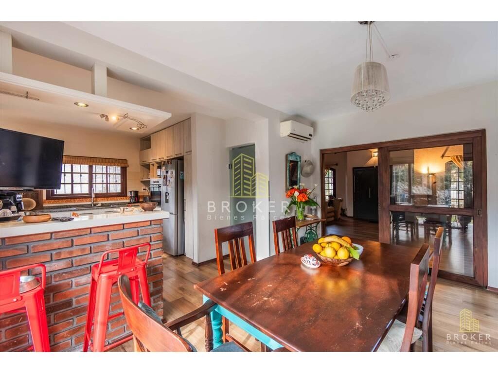 Cocina comedor con entrada de servicio, vental con salida al fondo, barra desayunador y equipamiento moderno.