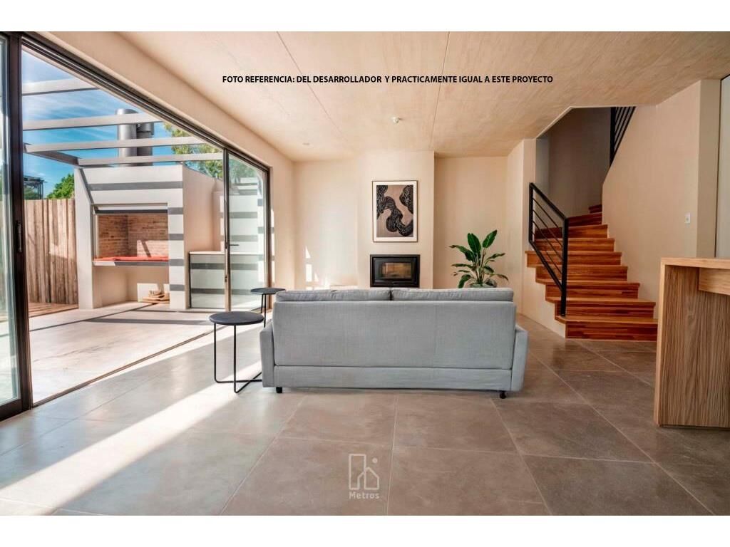 La casa se desarrolla toda en una sola planta, cuenta con 67m2 construídos + Jardín exclusivo. El Living comedor con estufa a leña es el ambiente más iluminado y con la mejor conexión a la Galería ¡un gran ventanal con orientación norte! La mejor iluminación natural todo el año. La Galería con parrillero tiene una excelente vista al amplio jardín privado de la casa, el mejor plan para disfrutar en familia!nLa cocina semi definida está integrada al área social con una barra desayunador, mobiliario bajo mesada y superior. Cuenta con 3 dormitorios, el principal es en suite. Todos los dormitorios cuentan con amplios placares. Cuenta con 2 baños completos, con excelentes terminaciones. La Calefacción es por losa radiante eléctrica con termostatos independientes por ambiente. Previsión de aire acondicionado en living y todos los dormitorios.Aberturas en aluminio con DVH, con cortinas de enrollar incorporadas en dormitorios.La casa cuenta con cochera para 2 autos.