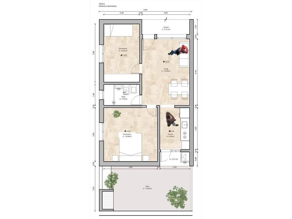 Casa de 2 dormitorios: living comedor, dos dormitorios al frente, cocina definida, baño completo patio con parrillero.