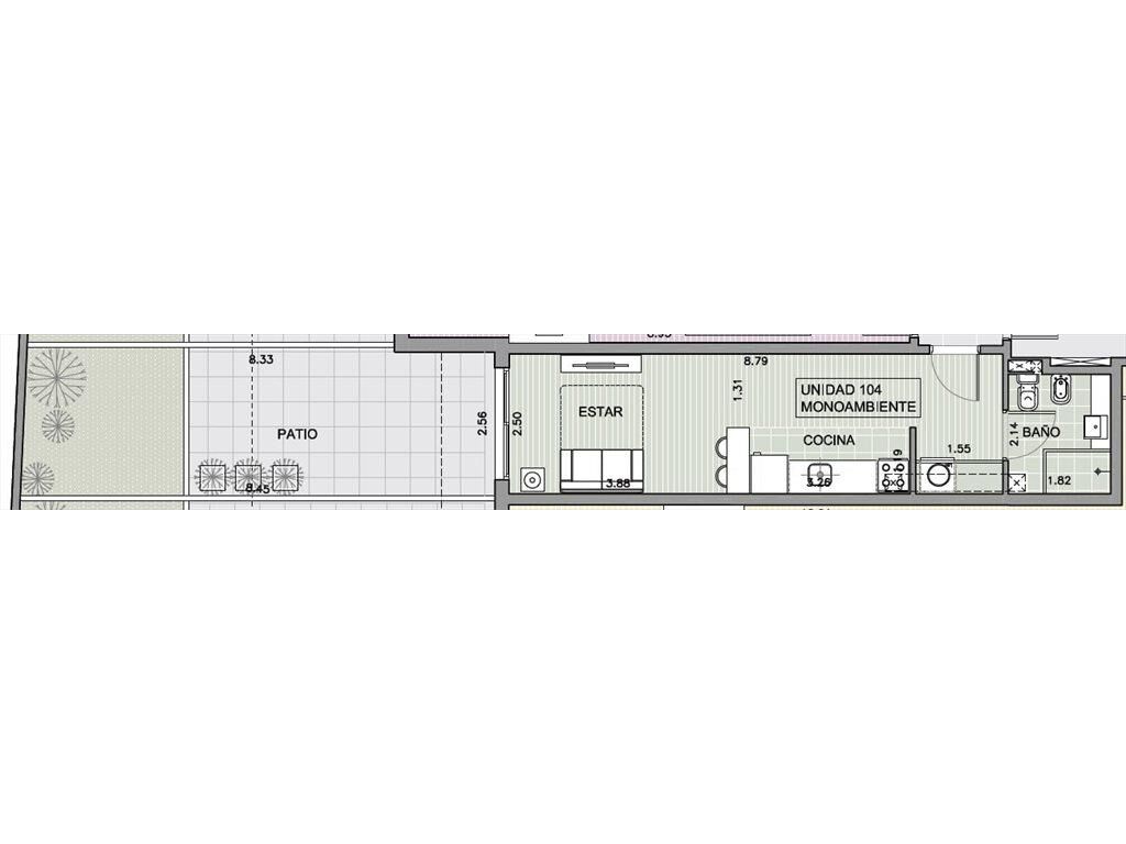 La unidad se ubica en el primer piso al contrafrente con orientación Oeste. Funcional monoambiente con cocina integrada al mismo, se destaca una gran patio de 22m2.