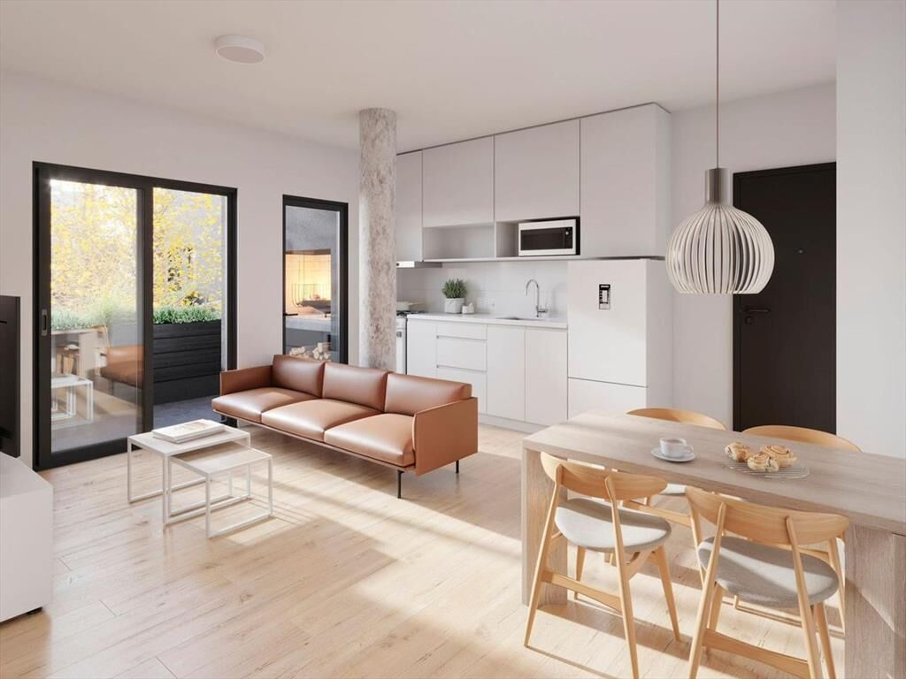 La distribución inteligente del espacio incluye una luminosa habitación, un baño completo y una práctica cocina integrada al living-comedor.