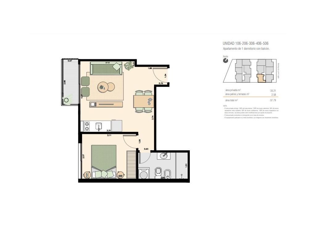 La unidad se encuentra en el primer piso, cuenta con living comedor con cocina integrada y salida a balcón, un dormitorio definido y un baño completo. Espacios bien resueltos, funcionales y con buena luz natural.