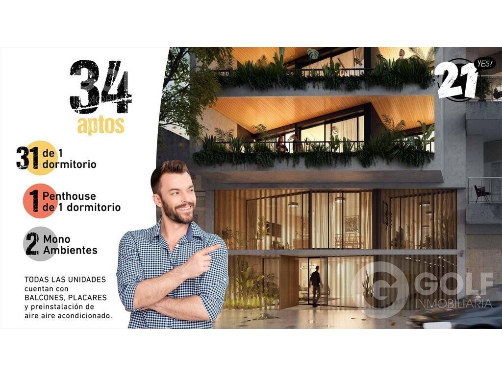 Se trata de un edificio de 34 apartamentos, los que se distribuyen 1 Penthouse , 2 Monoambientes, 31 apartamentos de 1 dormitorio