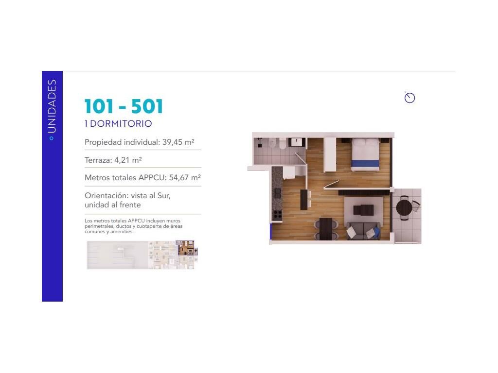 La unidad se encuentra en el primer piso al frente, cuenta con living comedor con cocina integrada mediante barra. Salida al balcón. Cómodo dormitorio al frente.