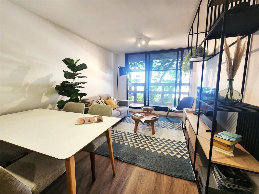 El apartamento cuenta con living comedor, cocina integrada con mesada y aéreos.1 dormitorio con acceso a amplio patio de uso exclusivo. Baño completo.