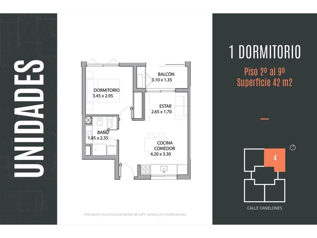 Living Comedor con acceso a terraza de uso exclusivo. Cocina integrada con mobiliario de exclusivo diseño, incluyendo bajo mesada y alacenas. Mesadas de granito. Revestimiento en porcelanato sobre mesada y hasta altura de alacena. 1 Dormitorio con placar en melamina, incluyendo cajoneras, espacio de colgado y estantes. Baño Completo.