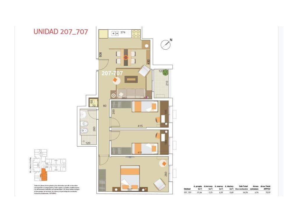 Piso 7 todo al contrafrente con orientación Norte, living comedor con cocina integrada al mismo con terraza lavadero, 2 dormitorios cómodos y 1 baño.
