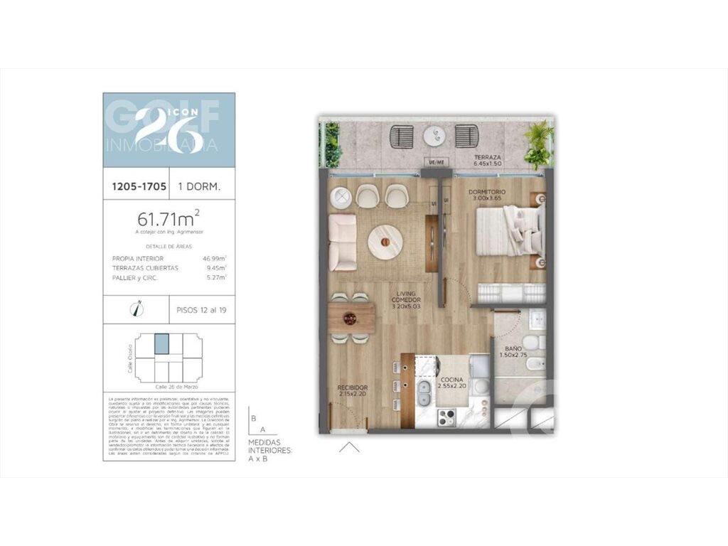 Venta Apartamento 1 Dormitorio con terraza en Pocitos - Hall de distribución - Living Comedor con salida a terraza - Cocina Integrada por barra - 1 Dormitorio UNIDADES: Aberturas de aluminio con alta prestación DVH Losa radiante electrica individual Pisos de madera natural plastificados semi-mate Cortinas de enrollar de aluminio en dormitorios Campana, horno y anafe en cocina Previsión splits AMENITIES: - Laundry de lavado y secado con app - 2 Barbacoas - Gimnasio - Terraza 360º - 275mts2 de layout libre para empresas - Lobby de diseño con concierge 24/7 - Paseo peatonal publico enjardinado - Plataforma con juegos para niños - Pick-up Lockers - Conexión para autos electricos - Bici parking Gastos de ocupación 4% Garages Opcionales INMOBILIARIA GOLF Afiliados a Cámara Inmobiliaria Uruguaya