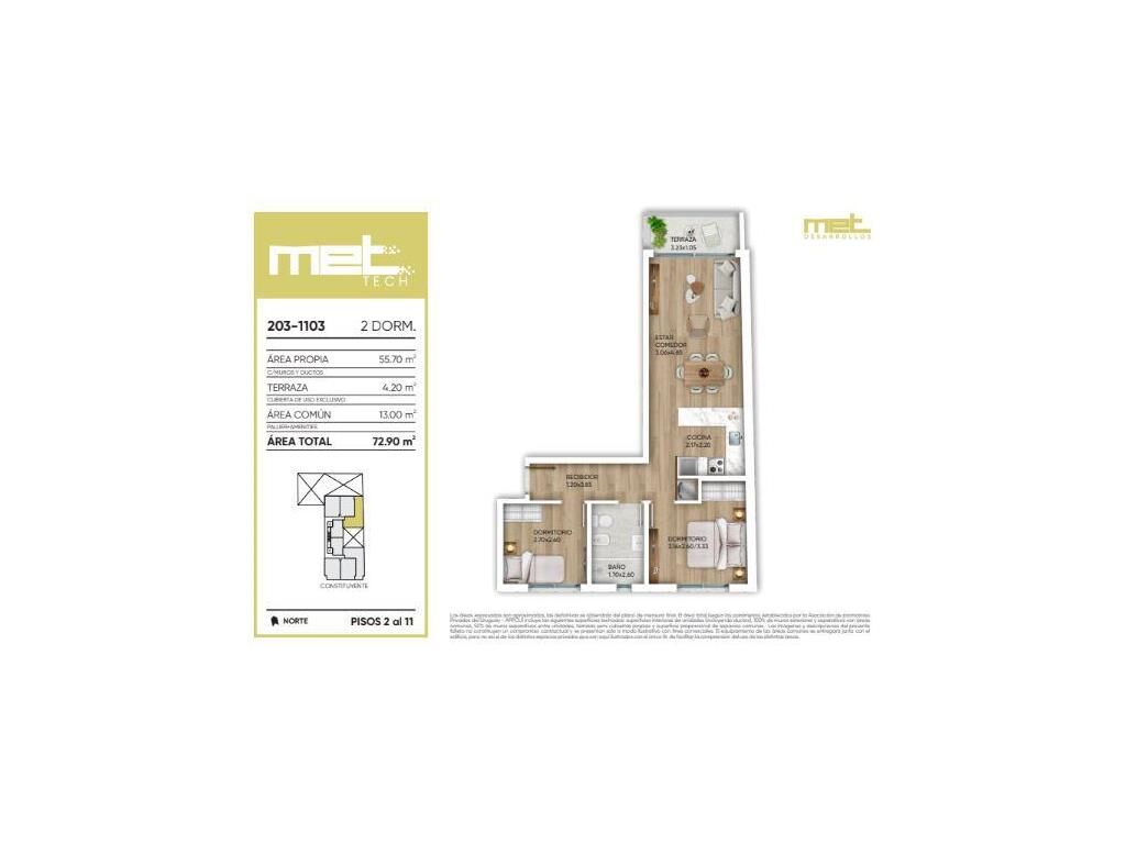 El apartamento cuenta con recibidor, living comedor con acceso a terraza de uso exclusivo. Cocina integrada con mesada y aéreos Baño completo. 2 Dormitorios