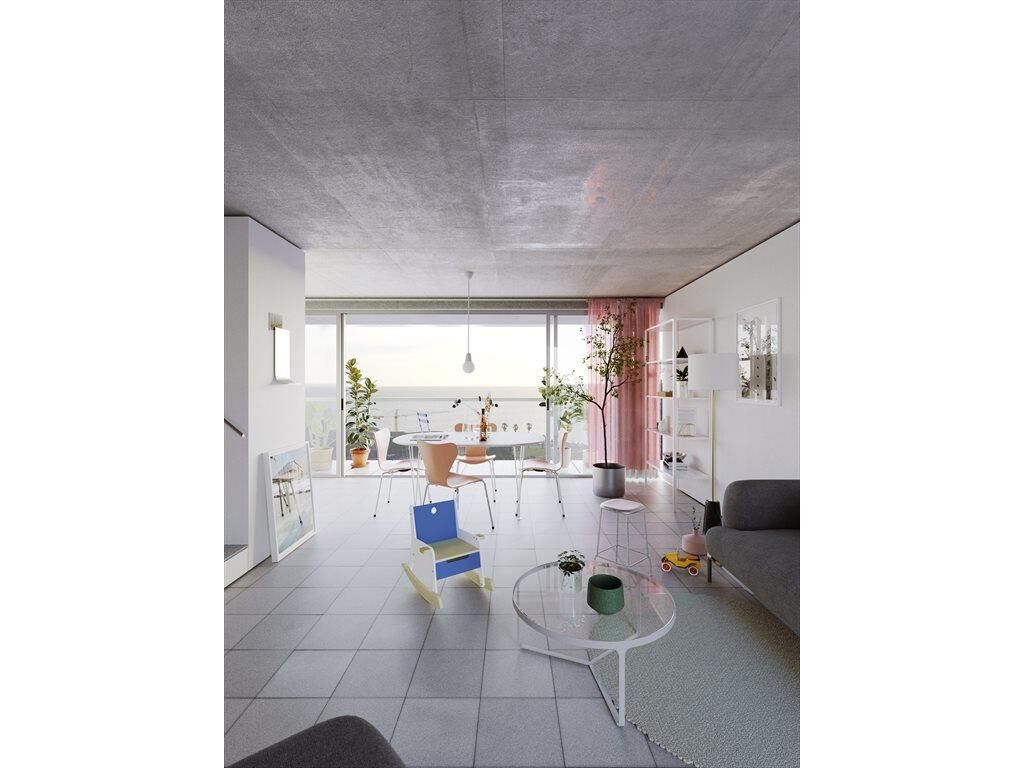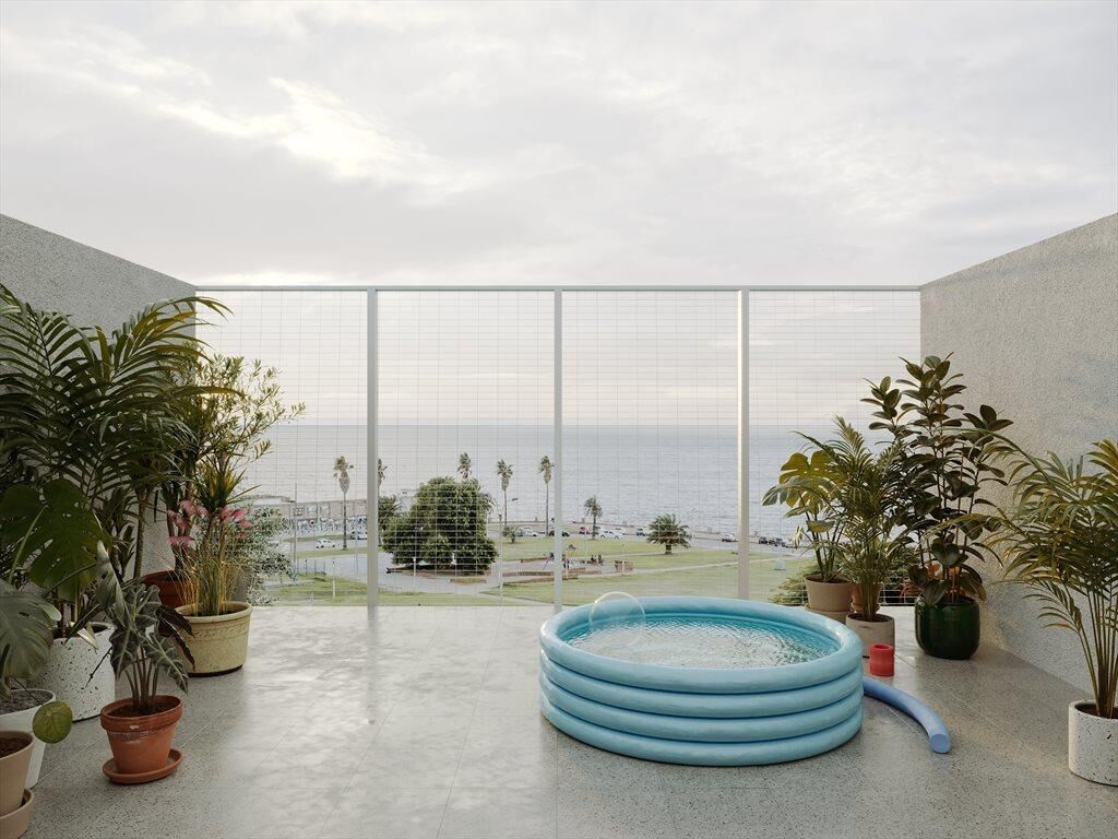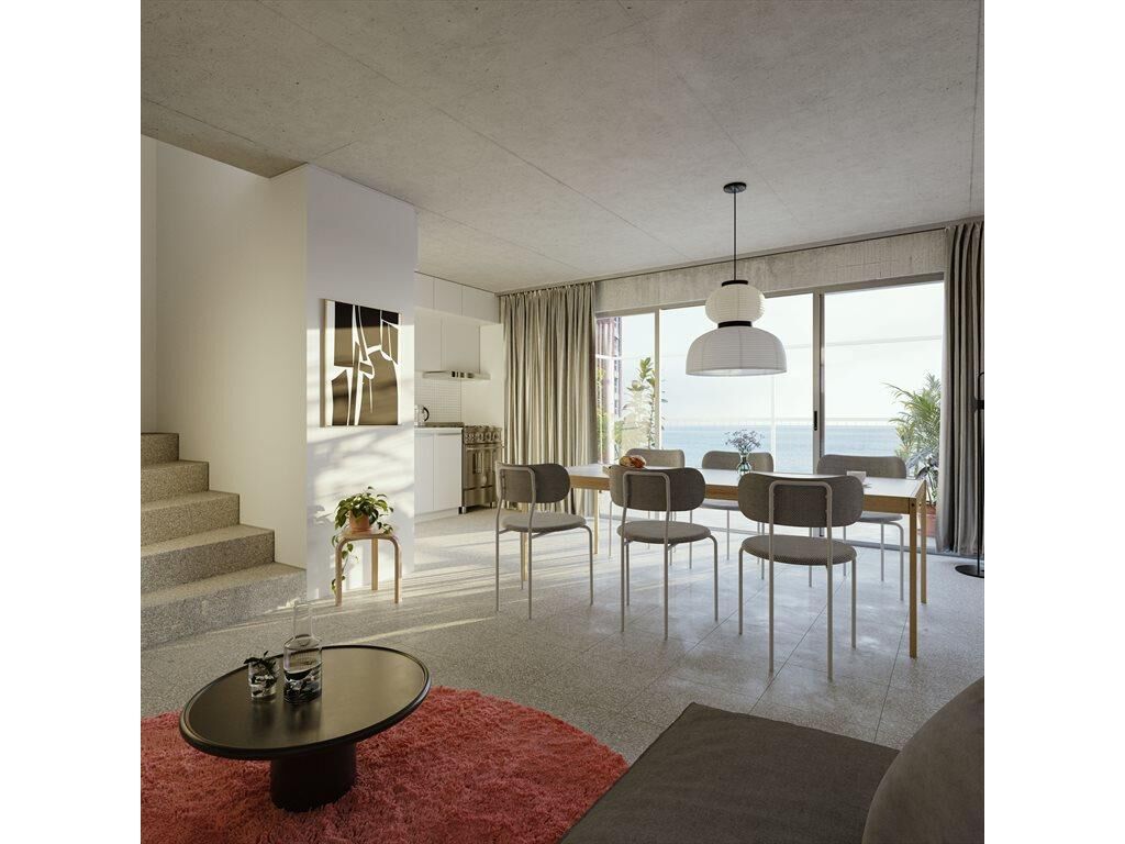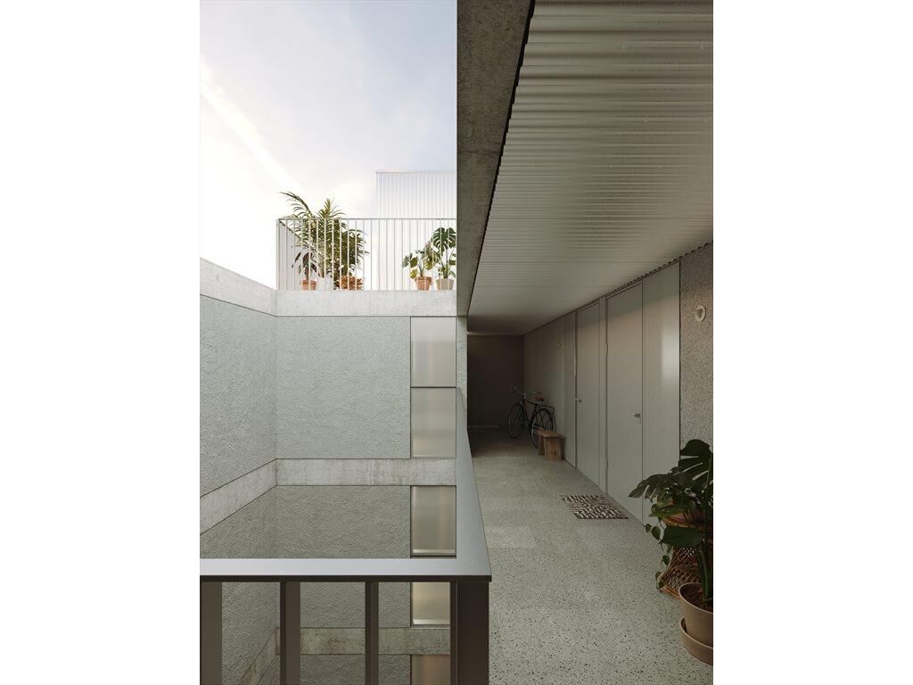 El edificio realiza un giro de 90 grados orientando su fachada principal hacia el Rio de la Plata sin desatender la continuidad con el entorno urbano inmediato. A través de un sistema circulatorio de pasarelas que ventilan a un patio interior se organizan 39 unidades.