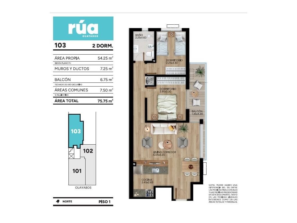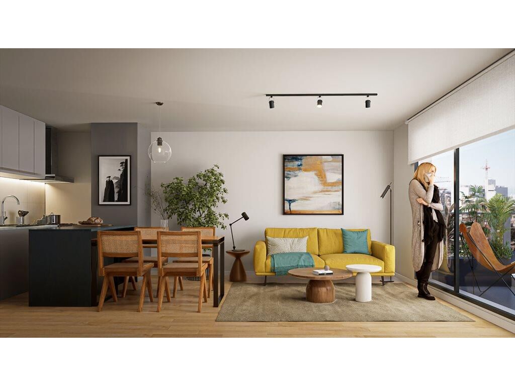 Primer piso al contrafrente con orientación Norte. Living comedor con cocina semi integrada mediante barra. Cómodo balcón con salida desde el living y dormitorio principal.