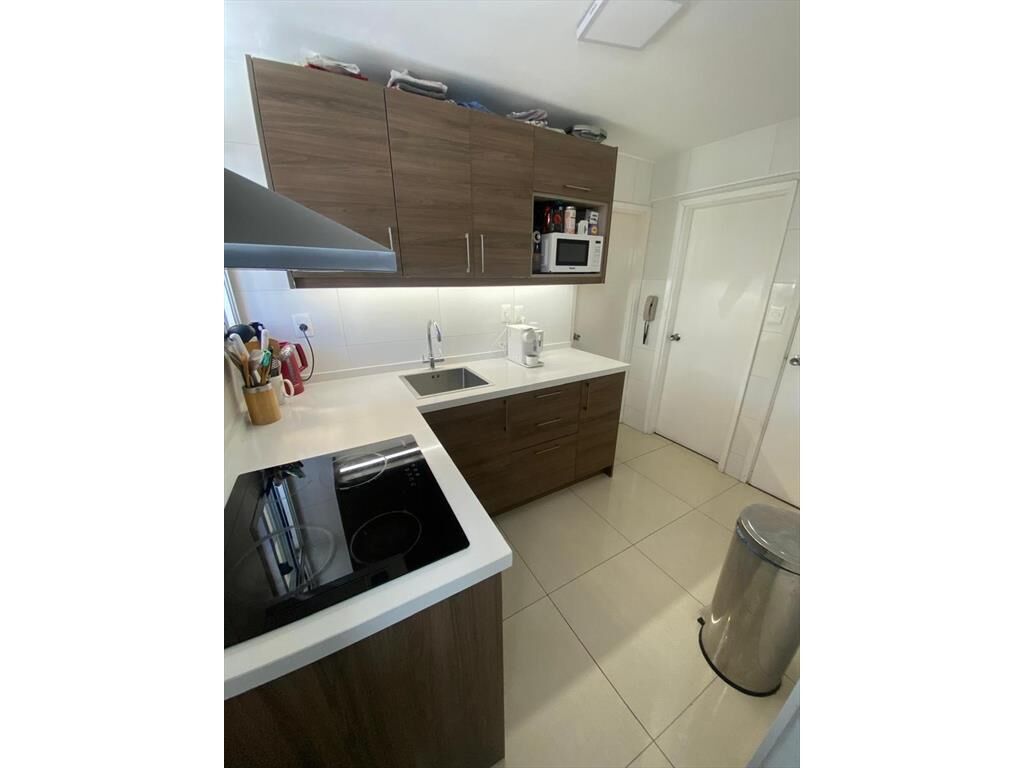 Cocina definida totalmente reciclada, mesada de silestone, con profusión de placares, anafe de vitrocerámica , horno y campana extractora.