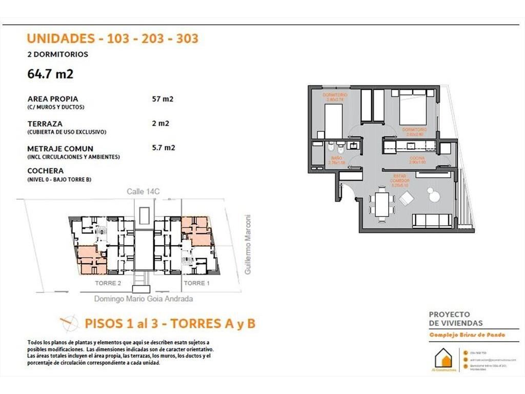 El apartamento ofrecido en este aviso es el 103, ubicado en el primer piso de la torre A. La unidad tiene una superficie de 57 m², con una distribución funcional.