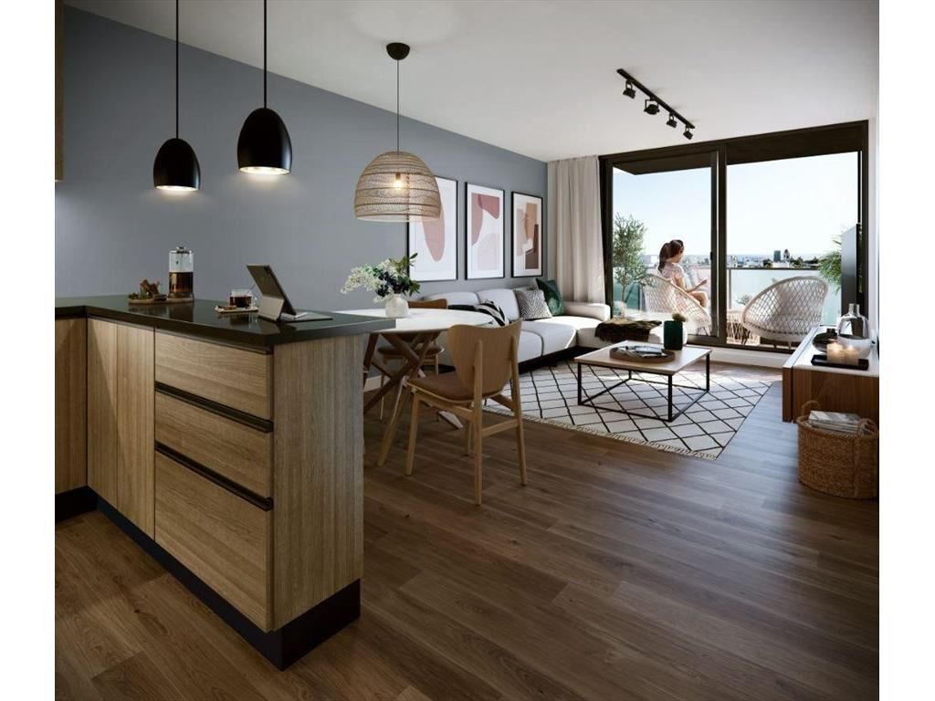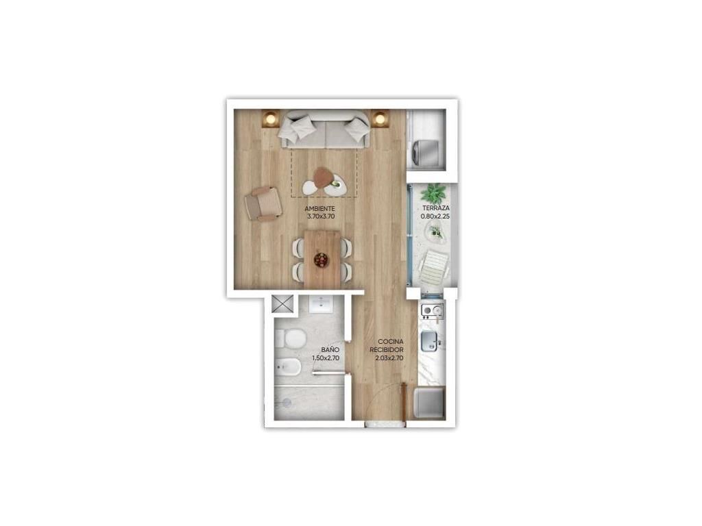 El apartamento cuenta con cocina semi-definida con mesada y aéreos. Ambiente principal con acceso a terraza de uso exclusivo. Baño completo.
