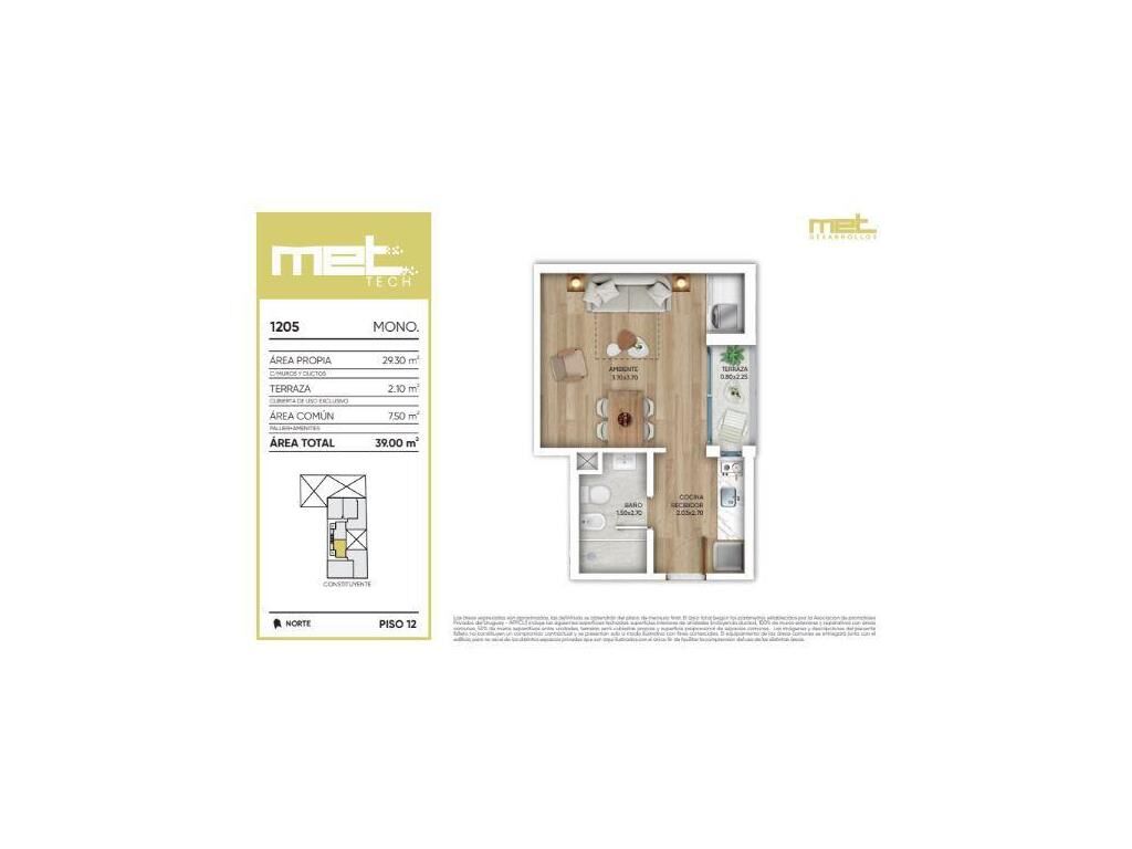 El apartamento cuenta con cocina semi-definida con mesada y aéreos. Ambiente principal con acceso a terraza de uso exclusivo. Baño completo.
