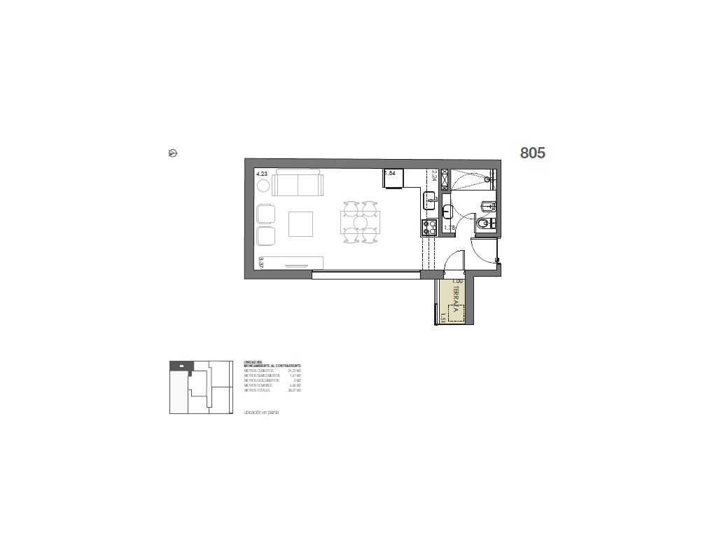 Apartamento en el piso 8° al contrafrente. Planta funcional, amplia y luminosa. Cuenta con Kitchenette, terraza y baño completo.