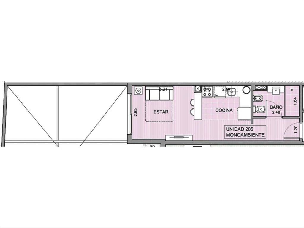 La unidad se ubica en el segundo piso al contrafrente con orientación Oeste. Funcional monoambiente con cocina integrada al mismo.