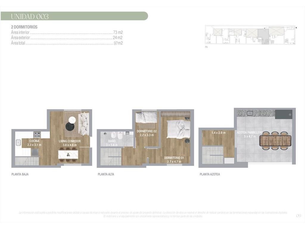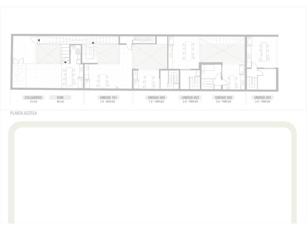 Unidad tríplex de 2 dormitorios, con ventilación e iluminación natural, provenientes de los patios centrales.
