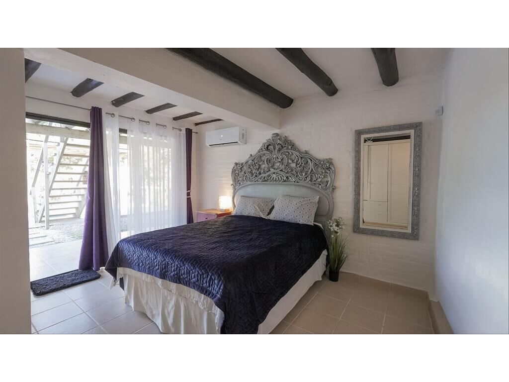 English -The home offers three spacious bedrooms, all with en-suite bathrooms, poolside access, and generous closets. The open living-dining area features air conditioning, art deco furniture, and antique touches. The kitchen includes a new stove/oven and a separate pantry with a modern double-door fridge.