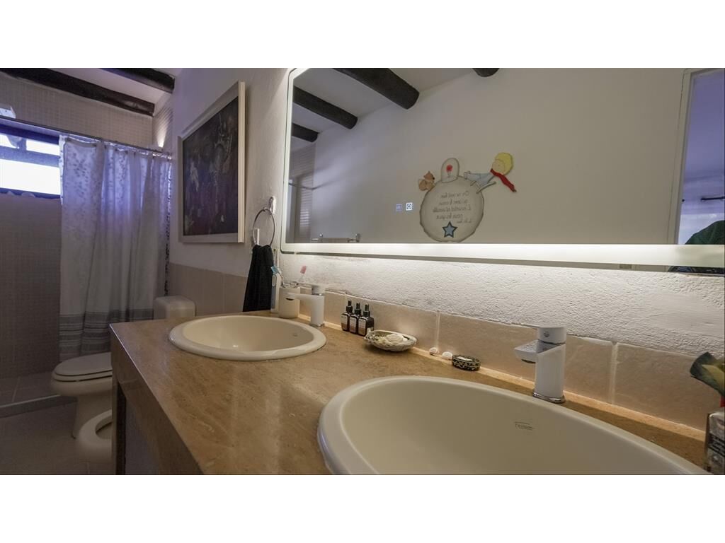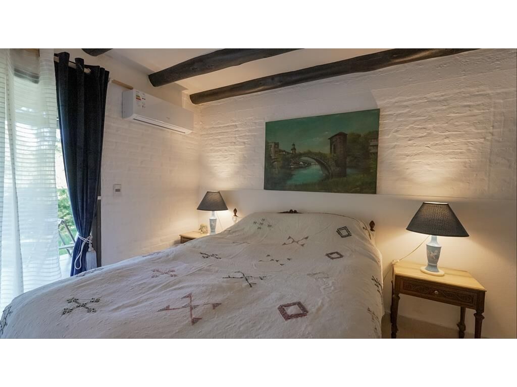 Cuenta con tres amplios dormitorios en suite, todos con acceso a la piscina y placares grandes. El living-comedor es abierto y luminoso, con aire acondicionado, muebles art déco y detalles antiguos. La cocina renovada incluye horno nuevo y una despensa con heladera americana doble.