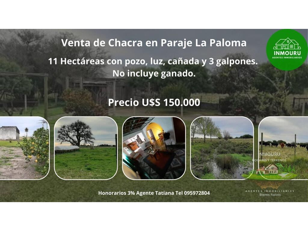 Venta de Chacra en Paraje La PalomaPrecio U$S 150.000Son 11 hectáreas con 3 galpones, cañada, pozo de agua semisurgente habilitado por Ministerio.Además, incluye linda casa.Honorarios 3% Agente Tatiana
