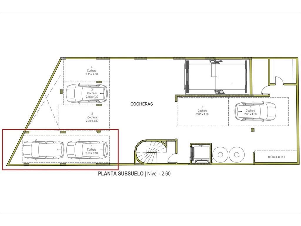 Cochera ubicada en el subsuelo del edificio. El acceso a la misma es través del portón exterior del edificio y cuenta con un ascensor montacargas que conecta con los distintos niveles de estacionamiento.