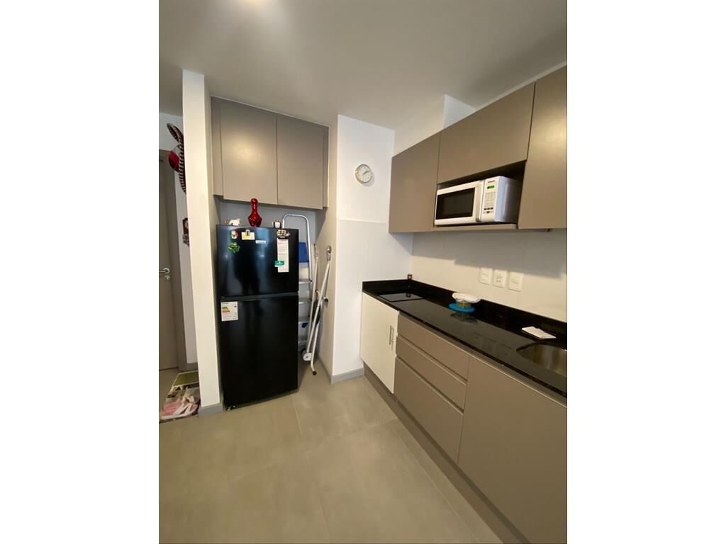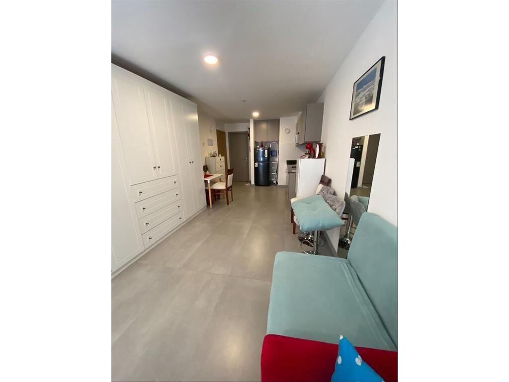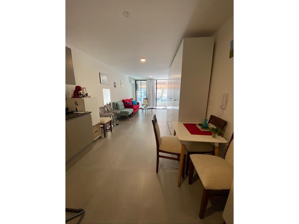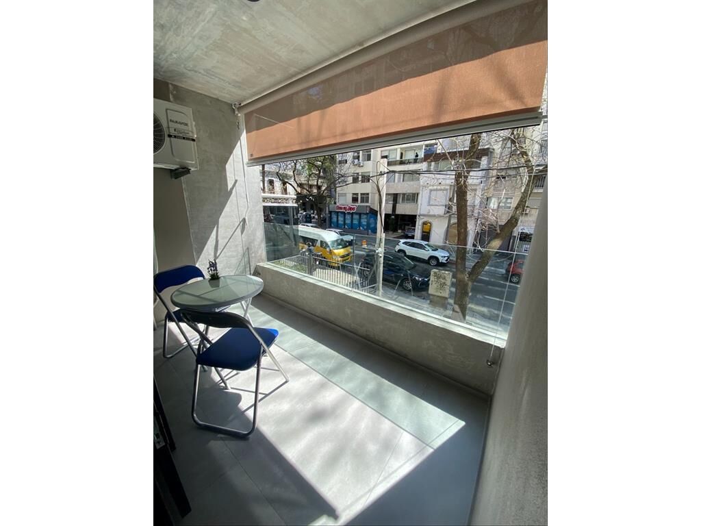 Al frente, terraza de 5m2 y ambiente de 30m2 con kichinette integrada, equipado con placard, cocina vitrocerámica empotrada, microondas, heladera y calefón, baño amplio.