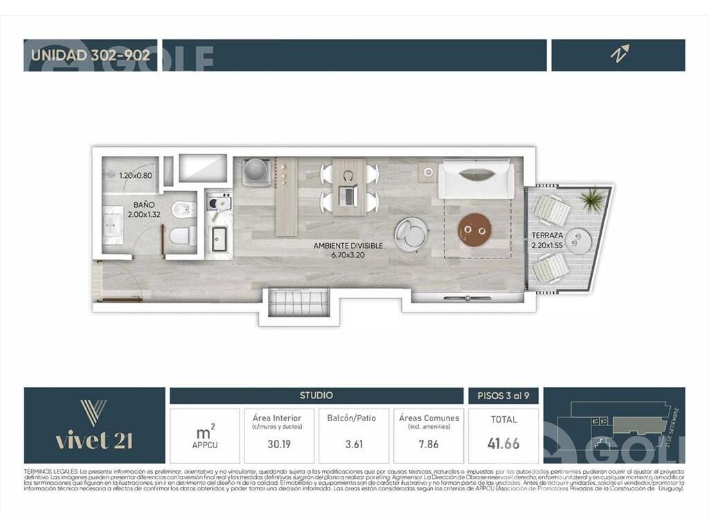 Venta Monoambiente con terraza en Punta Carretas - Living comedor con salida a terraza - Cocina integrada por barra - Baño Completo - 3650 m2 en 13 plantas. - 2 subsuelos. - 45 apartamentos. - Studios, 1, 2 y 3 dormitorios. - 23 garages con previsión para carga eléctrica individual. - Bike parking. - Oficina comercial en Planta Baja. - Laundry con tarjeta o app. - Clasificador de residuos. - Sky lounge con barbacoa cerrada, cocina y parrilla. - Barbacoa con outdoor lounge y vista panorámica. Gastos de ocupación: 4,25% INMOBILIARIA GOLF Afiliados a Cámara Inmobiliaria Uruguaya